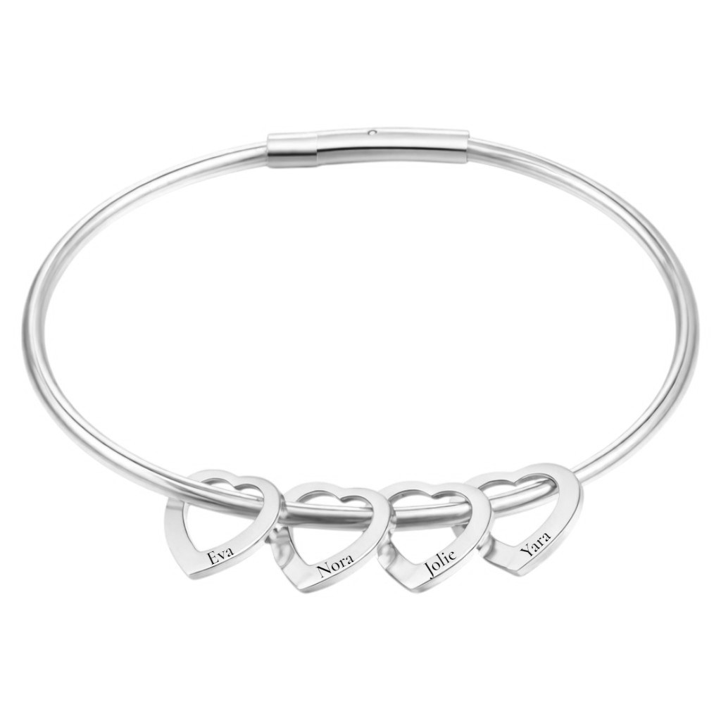 Draag je geliefde dichtbij met deze armband bangle met 4 hartjes. De hartjes zijn per stuk graveerbaar met 1 naam, datum of initialen, vul jouw gewenste tekst in en wij graveren het gratis voor jou op de hartjes. De armband is verkrijgbaar in het goud en zilver, maar ook met 1, 2, 3 of 5 hartjes!