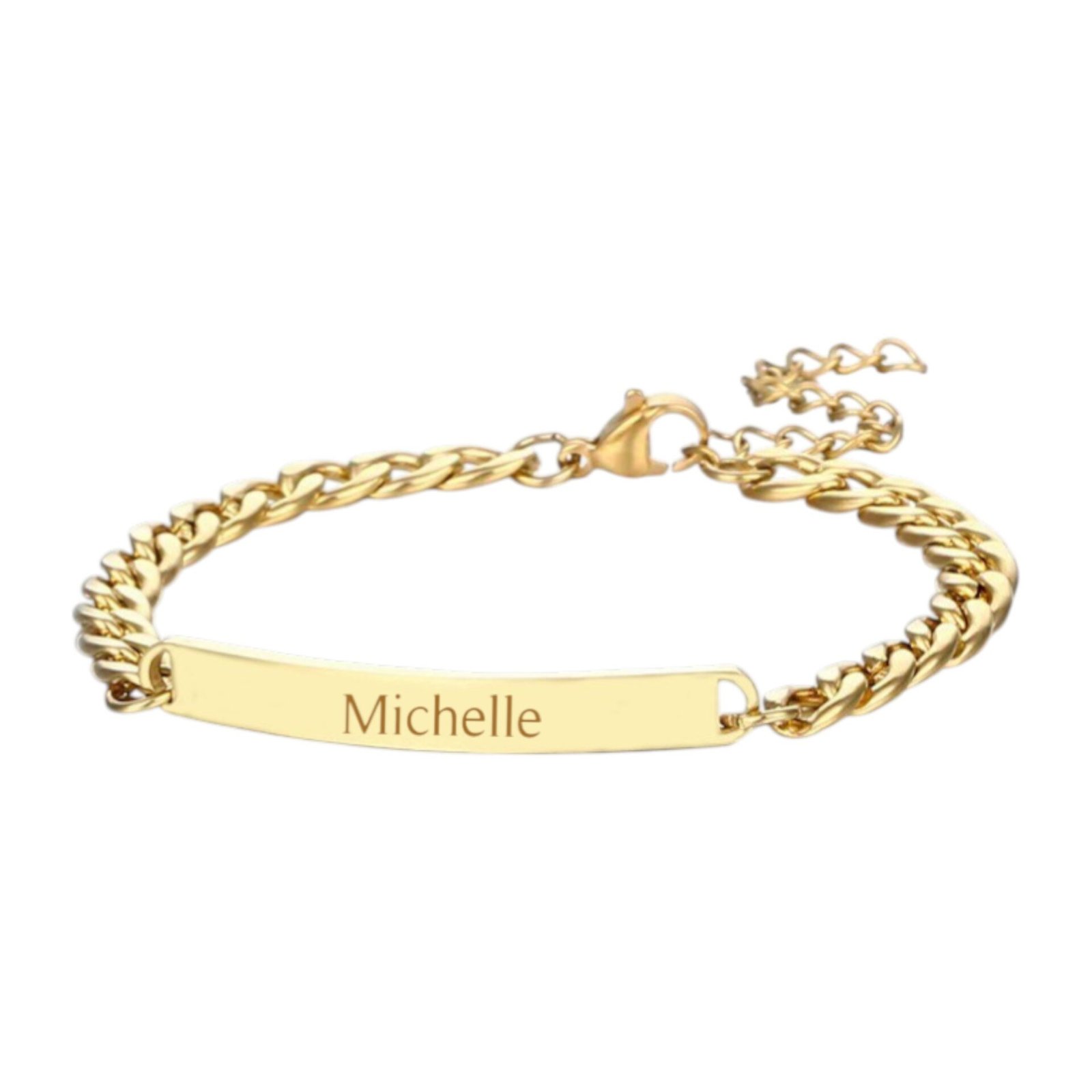 Draag de naam van jezelf of een geliefde dichtbij met de dames schakelarmband met naam! Deze prachtige schakelarmband is voorzien van een graveerbare bar waarop wij gratis iets naar wens graveren. Ga jij voor de naam van je geliefde of jezelf, of juist voor de initialen van je ouders of kinderen? Maak je sieraad nog persoonlijker door de achterkant te laten graveren met een tweede naam of bijvoorbeeld een plaats, tekst of datum.