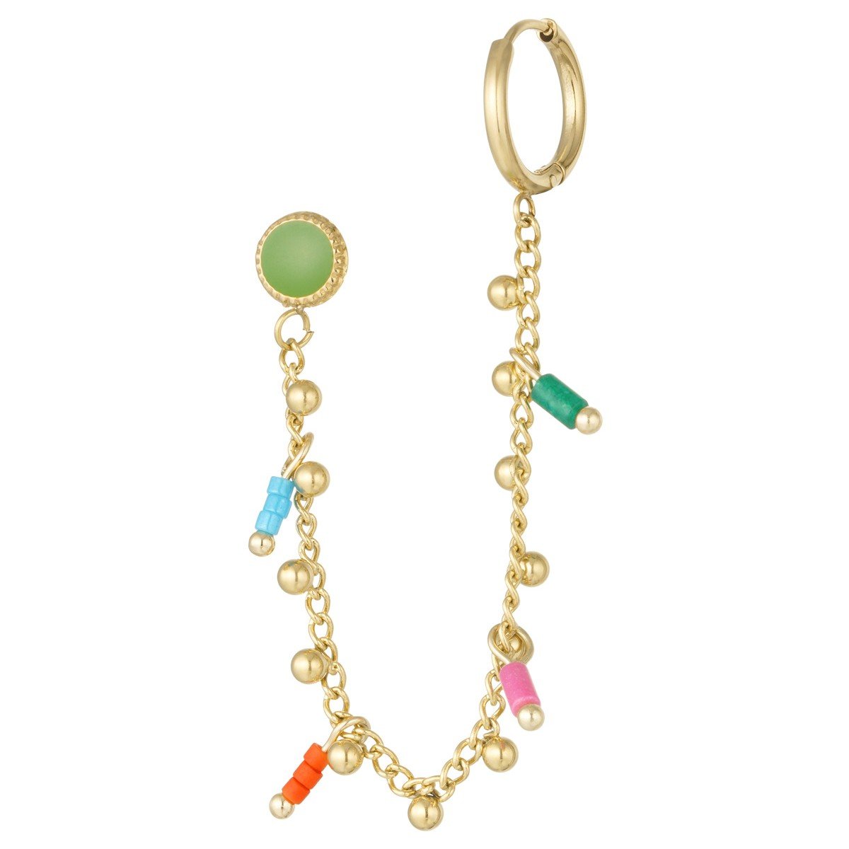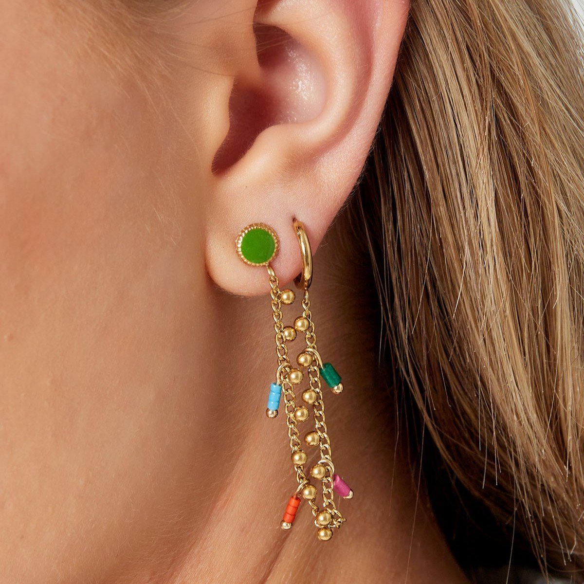 Wauw deze dubbele oorbel Kim heeft super vrolijke kleurtjes! De oorbel gaat door twee oor gaatjes. De oorbel is gemaakt van hoogwaardige materialen zoals stainless steel en glaskralen. De afmeting van de oorbel is 1.2 bij 9.8 centimeter.
