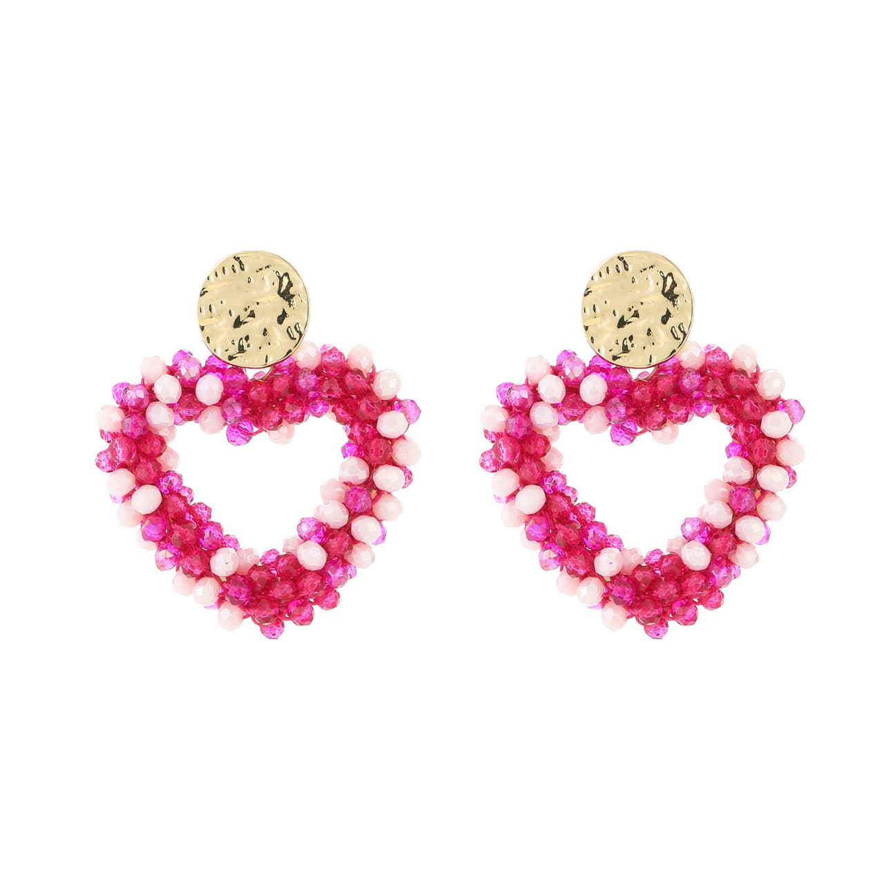 Trend alert! Met deze hart oorbellen met kralen roze val jij zeker op! Deze oorbellen zijn echte statement pieces. De oorbellen hebben gouden accenten en de hartjes zijn voorzien van een mix van roze gekleurde kraaltjes.