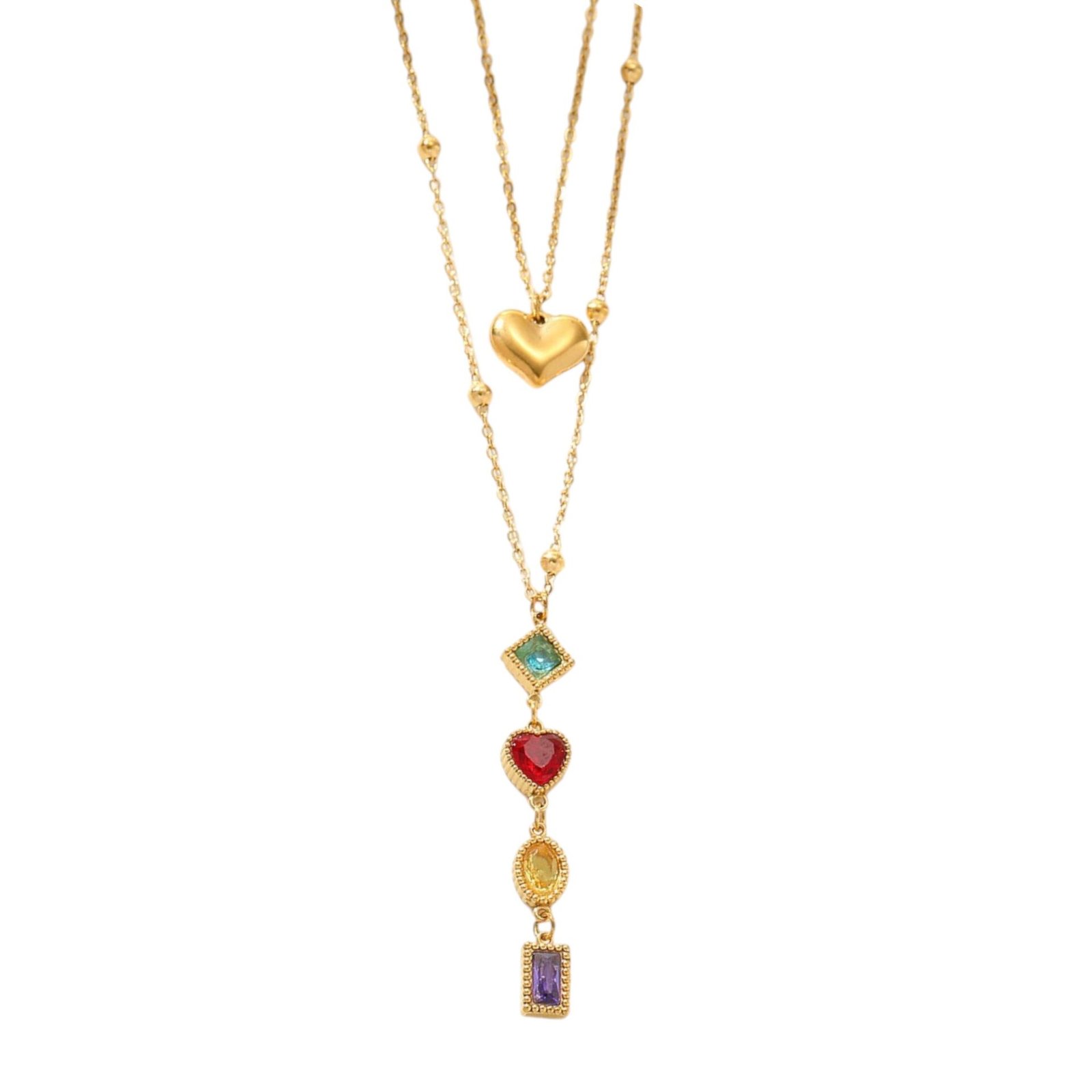 Ketting Meghan is een dubbele en kleurrijke ketting die voorzien is van meerdere vrolijk gekleurde zirkonia steentjes en een hartje. De ketting is gemaakt van roestvrij staal en is daardoor waterproof en hypoallergeen.