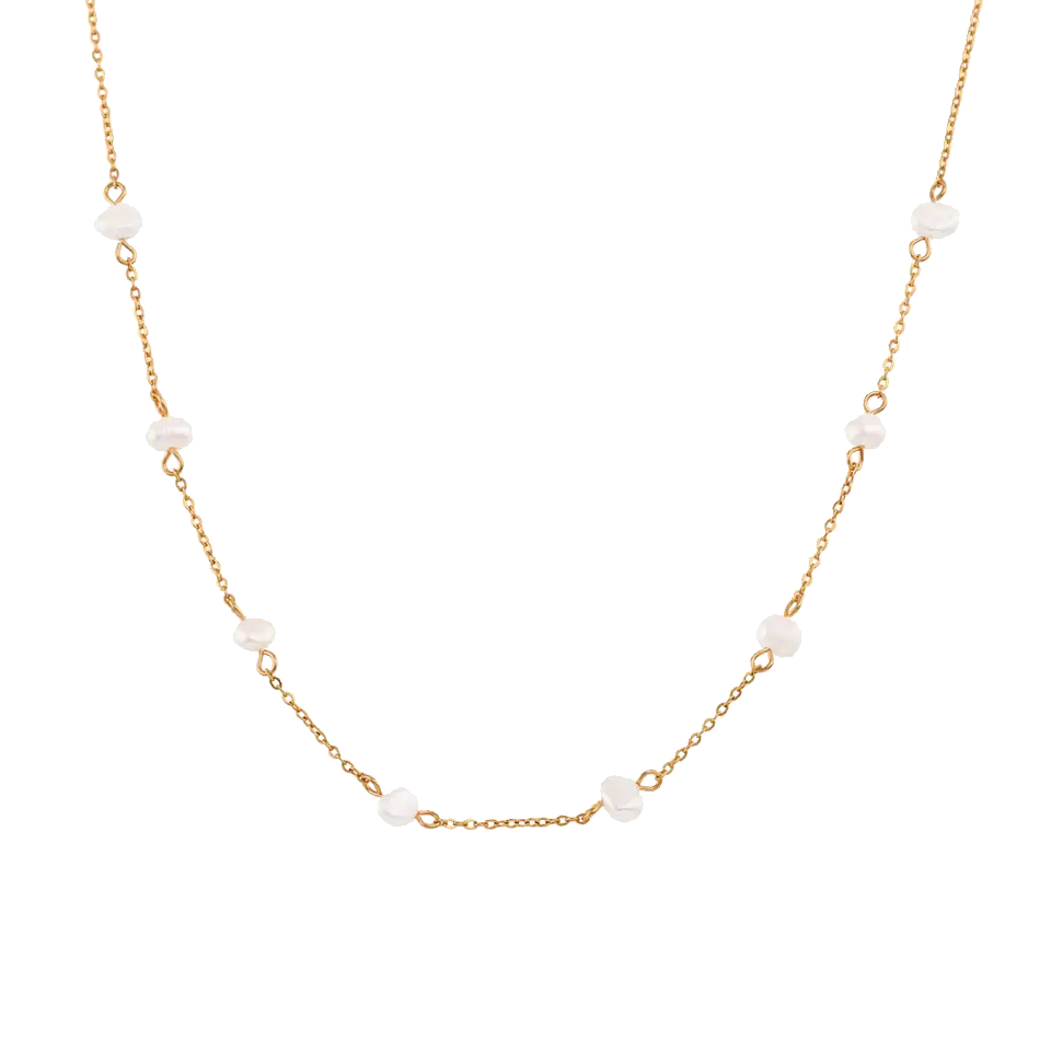 Ben je op zoek naar een sierlijke ketting die je outfit een chique touch geeft? Dan is de ketting Pearl iets voor jou. Deze ketting is gemaakt van stainless steel en is daardoor waterproof en hypoallergeen. De ketting is versierd met kleine pareltjes die glinsteren in het licht. De ketting is verstelbaar en past voor iedereen.