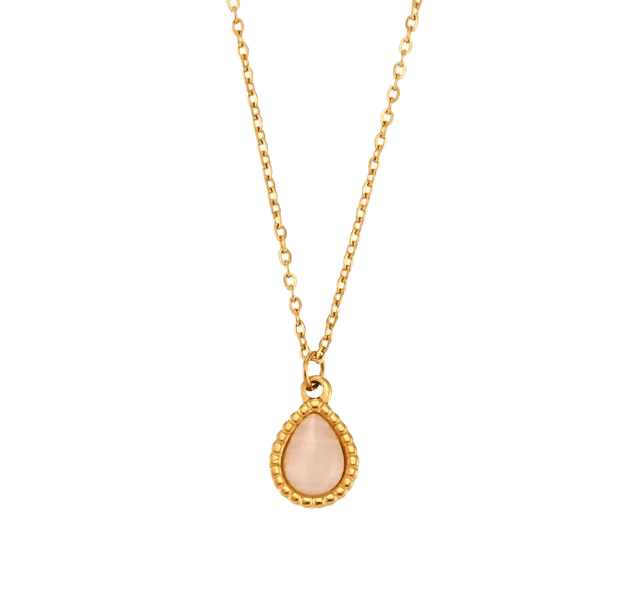 Deze mooie gouden ketting heeft een hanger in de vorm van een waterdruppel met een wit kristal. De ketting is ook verkrijgbaar in de kleuren blauw, groen en roze. De ketting heeft een lengte van 40+5 cm.