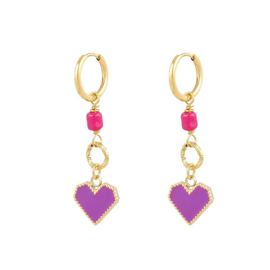 Ontdek nu de prachtige oorbellen Olivia uit onze love collectie! Deze lange gouden hoops zijn gemaakt van roestvrij staal en zijn daardoor waterproof en hypoallergeen. De oorbellen hebben lange hanger van een roze kraaltje, ringetje en paars hartje.