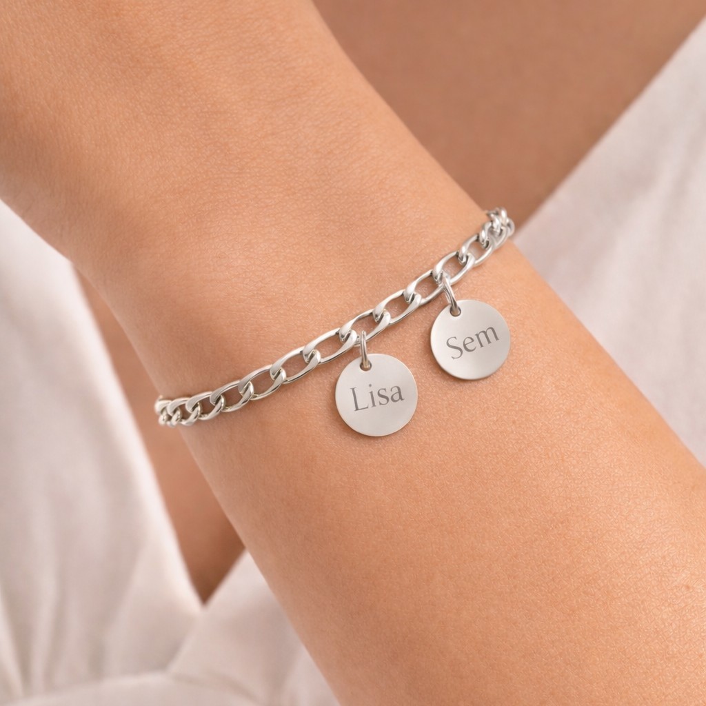 Tags: Armband, Bracelet, Charlery, Gegraveerd, Gegraveerde, Gepersonaliseerd, Gold, Goud, Graveer, Graveerbaar, Graveerbare, Graveren, Initiaal, Initial, Initialen, Initials, Naam, Name, Namen, Names, Personal, Personalised, Personaliseren, Persoonlijk, Persoonlijke, Roestvrij staal, RVS, Silver, Stainless steel, Waterproof, Zilver
